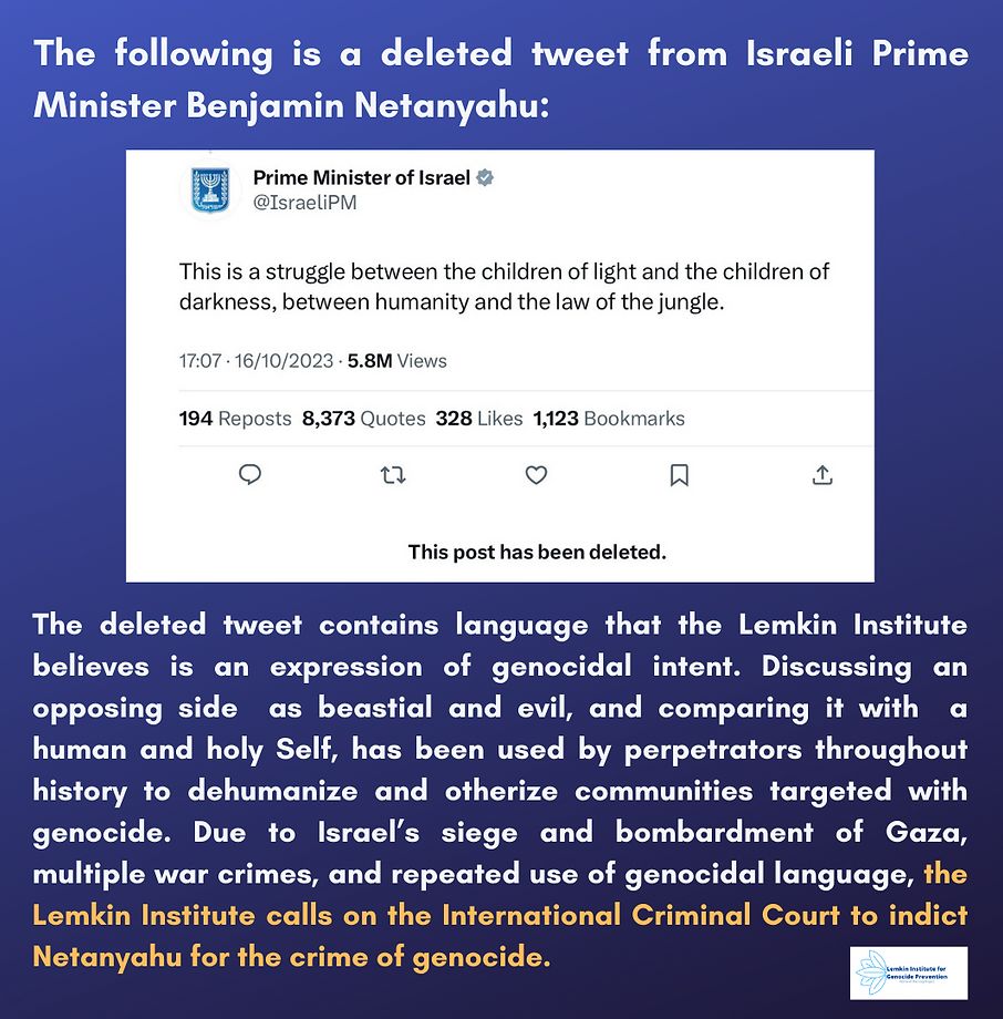 10. Lemkin Institute for Genocide Prevention: October 18, 2023. The Lemkin Institute calls for Israeli Prime Minister Benjamin Netanyahu to be indicted by the International Criminal Court for the crime of genocide.