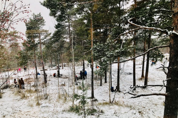 Children explore the first day of snow outside their school building on wooded lands at the Roihuvuori Comprehensive School, Helsinki, Finland. (Theodore Christou), Author provided