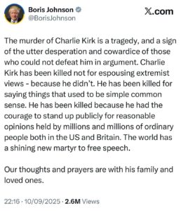 Charlie Kirk was killed for saying things “that used to be simple common sense,” says Boris Johnson. Here are a few of those “common sense” things: