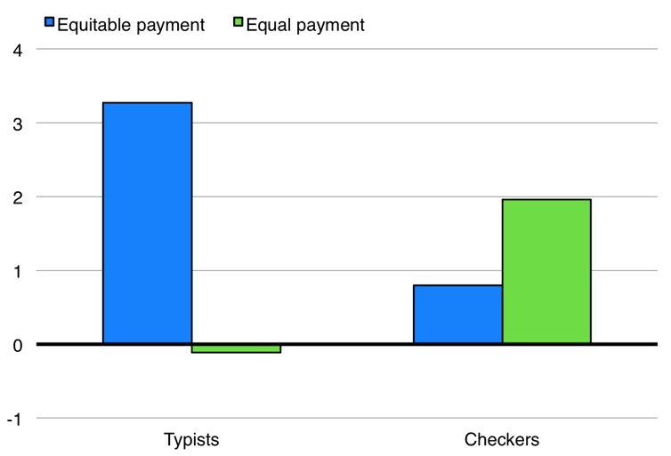 In an experiment, Peter DeScioli and colleagues randomly assigned participants to either be “Typists” and transcribe three paragraphs, or to be “Checkers” and transcribe one of the three paragraphs to check for accuracy. Participants were then asked about the fairness of being paid equitably, so that Typists would earn three times more than Checkers, or equally, so that both Typists and Checkers would earn the same amount. Typists believed that equity was the fairer arrangement, whereas Checkers believed that equality was the fairer one. Thus, personal profit and beliefs about fairness coincided neatly.