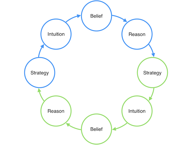 A strategic model of moral psychology. One person (in blue) has a strategy that informs her intuition. This, in turn, informs her beliefs. She then uses reason to justify her beliefs to someone else (in green), in an attempt to bring his beliefs closer to her own. However, he will also be influenced by his own strategy that informs his intuitions, and therefore his beliefs and reasoning.