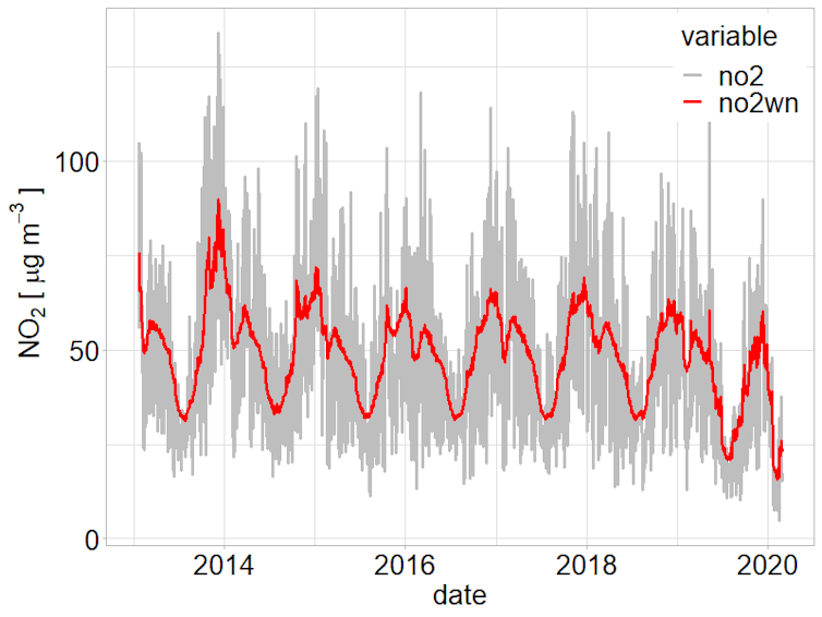 We used a recently developed predictive machine learning method (a type of data analysis that identifies patterns in data and learns from them) to strip out the effects of weather conditions (wind speed, wind direction and temperature significantly affect local pollution concentrations). The graph below shows the large difference between observed nitrogen dioxide (NO₂) concentrations and “weather-normalised” concentrations (in red), from which the effect of weather conditions has been removed.