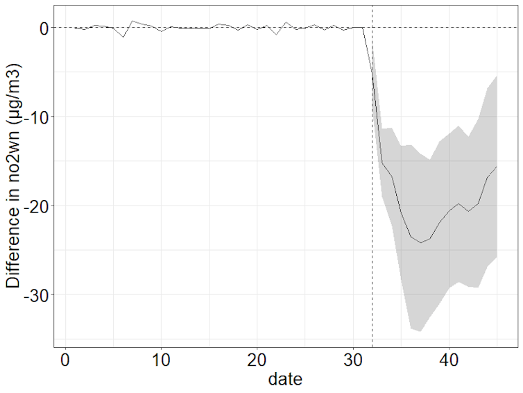 The results show that Wuhan experienced a significant reduction in concentrations of NO₂ and particulate matter (PM10) – sometimes known as floating dust – as a result of the lockdown. The second graph shows the difference between NO₂ concentrations in Wuhan and the synthetic control group before and after the lockdown.