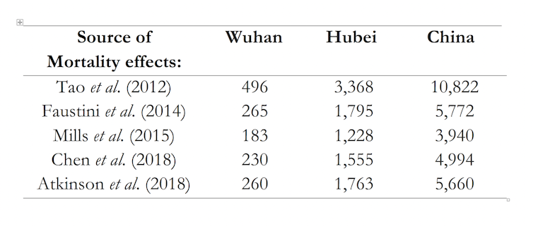 While our analysis indicates that pollution fell by up to 24 micrograms per cubic metre for the first two weeks of the lockdown, we assumed that over the full duration of the lockdown it fell by an average of 20 micrograms per cubic meter. Our findings suggest the lockdowns may have prevented up to 496 deaths in Wuhan, 3,368 in Hubei province and 10,822 in China as a whole.